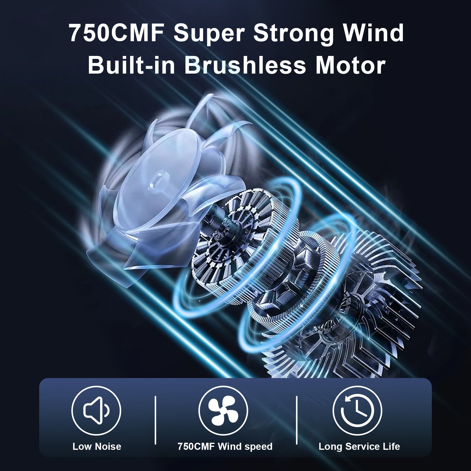 With its brushless motor delivering up to 780 CFM, adjustable speed control, and whisper-quiet operation, this fan is designed for job sites, camping tents, garages, offices, and RVs. Its rugged handle and hidden hook allow flexible placement, whether carried by hand or hung vertically.
